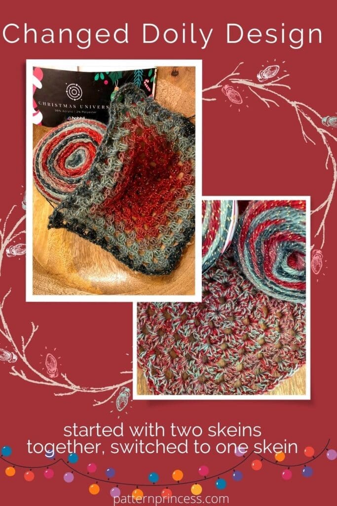 Well, I am not sure that we have still captured the yarn colors, but we did see how the sparkles in the yarn twinkle in the light. Just imagine this doily under your favorite Christmas village display or other Holiday decorations. If there is anything with a pretty lighting display, this handmade doily will give you a glittery light show.