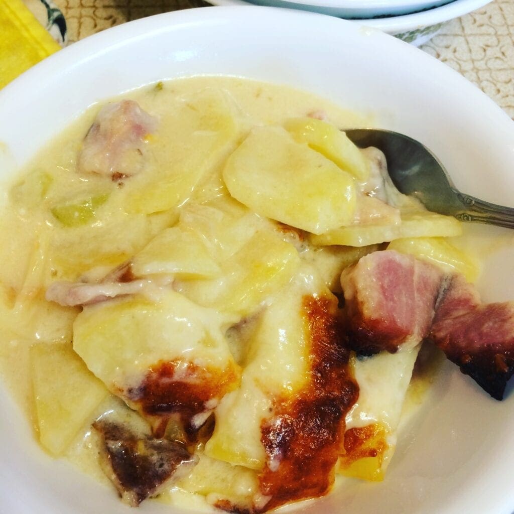 This recipe for cheesy, ham, potato bake goes together quickly and is very creamy with a good flavor. It is comfort food.