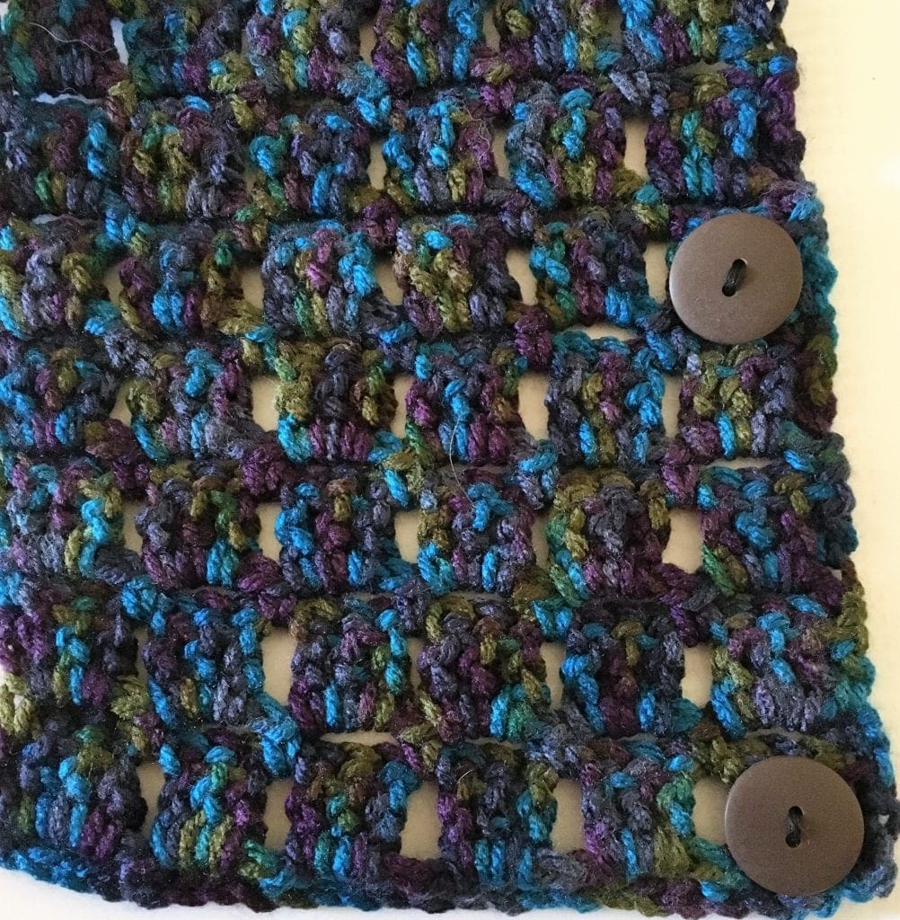 This neck warmer has buttons to help secure this cowl in place. I used the block stitch to create this lovely textured neck warmer. It is a quick crochet project and I love how the colors of the Peacock yarn come together.