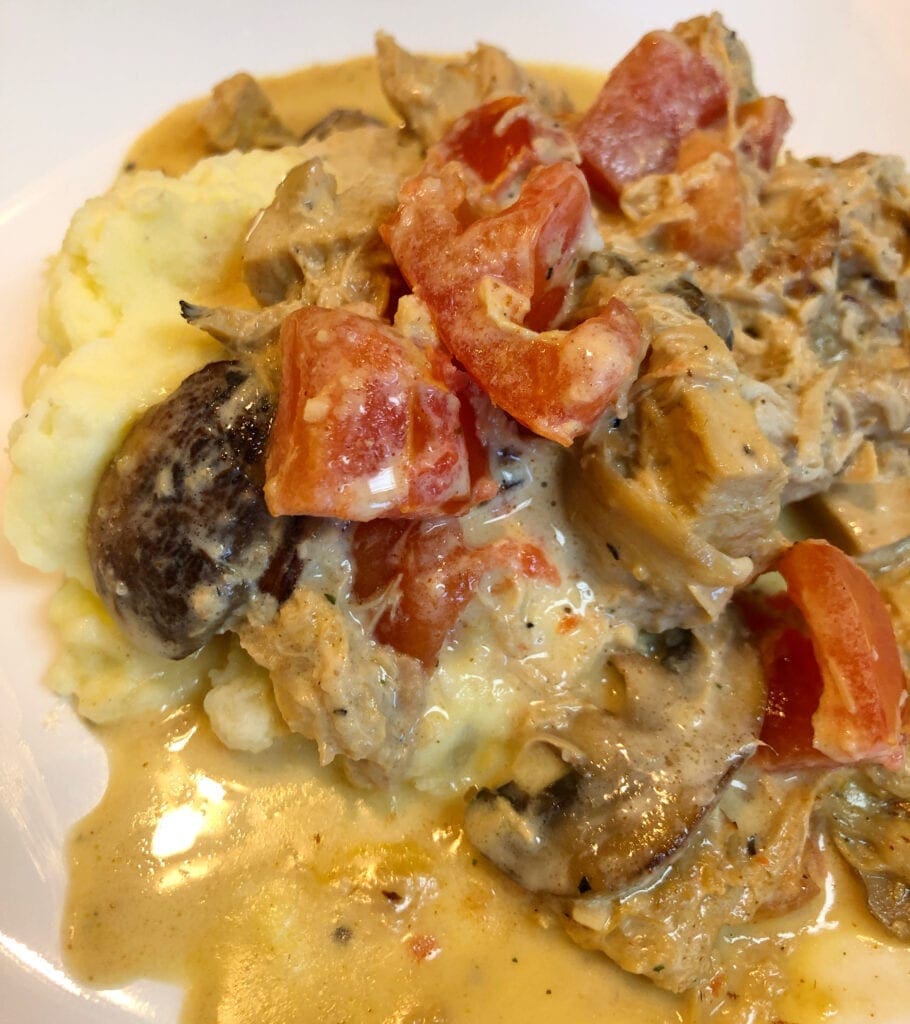 The photo above shows this quick chicken recipe served over the mashed potatoes with homemade garlic bread. Perfect for getting up the last of the sauce.