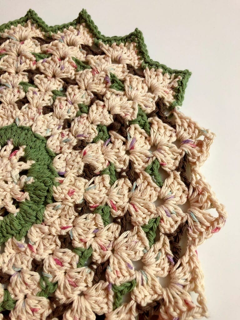 Embellish your tables and furniture with this lovely mat. Creating this charming design requires only basic crochet stitches. I’ve crafted it with a contrasting color of green and brown for both the center and the edges. However, using a variegated yarn for crocheting would also produce an appealing look.