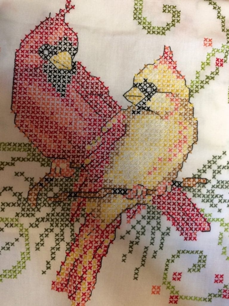 This stamped cross stitch cardinal table runner is a project that does take some time. Focus on one section at a time. Celebrate the completion of each section and move onto the next. It can be done if you keep after it. Working on a stamped cross stitch project can help melt the stress of the day away. What a great way to clear my mind just before going to bed so I don’t keep thinking about all of the work I have to do yet. You still get something don while you are relaxing.