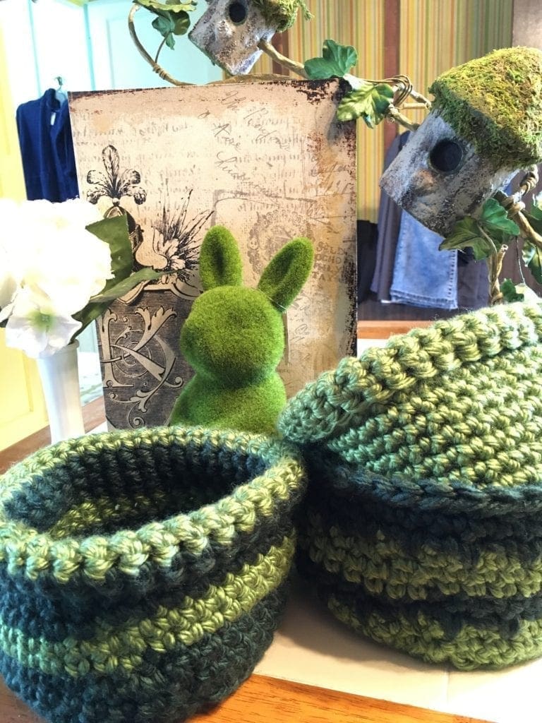 Once I knew the basics of creating a crochet basket, I went to the store and purchased several skeins in beautiful colors. Then I made a bunch in a variety of patterns making it all up as I went along.