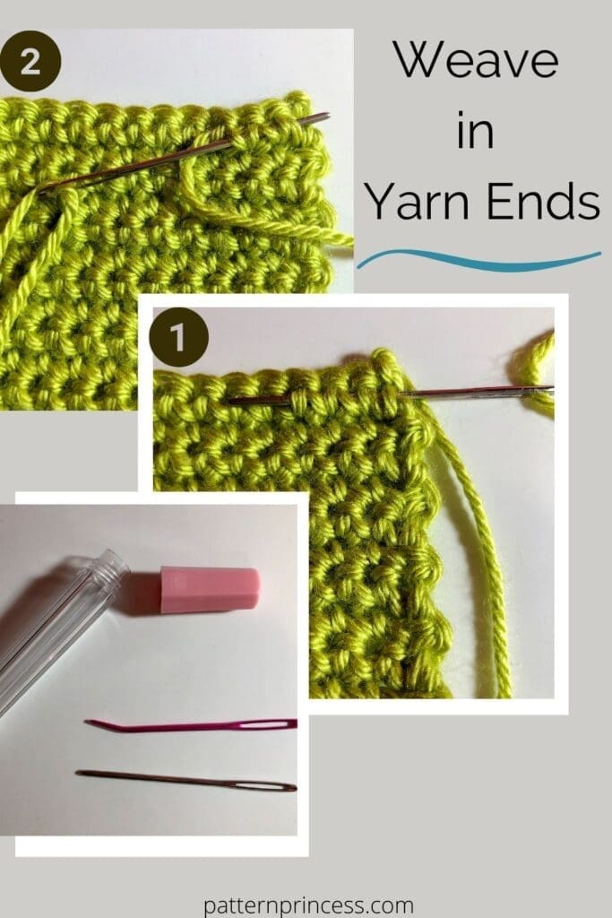 - I like to do this a few times and depending on the type of crochet project I am finishing off; I may weave into a different row and work back and forth a few times as well for added security of the yarn tail. Crochet Pro Tip: It is a good idea to weave in the end of the yarn in different directions. Additionally, if the project involved color changes, weave the yarn in the same color as the row of stitches worked for an invisible finish.