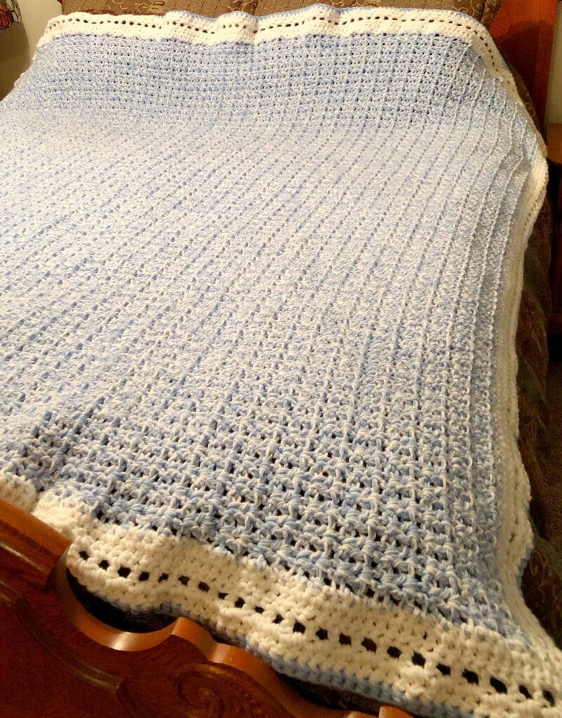 (note: I used 3 full skeins of white and sky blue for the blanket portion)