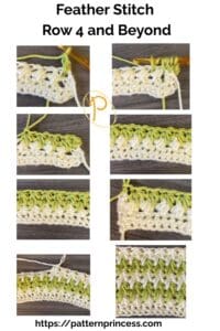 Row 3. CH 1 (Does NOT count as a ST). HDC in the first ST, CH 1. Work the feather stitch across. End with a HDC in the last ST. Turn
